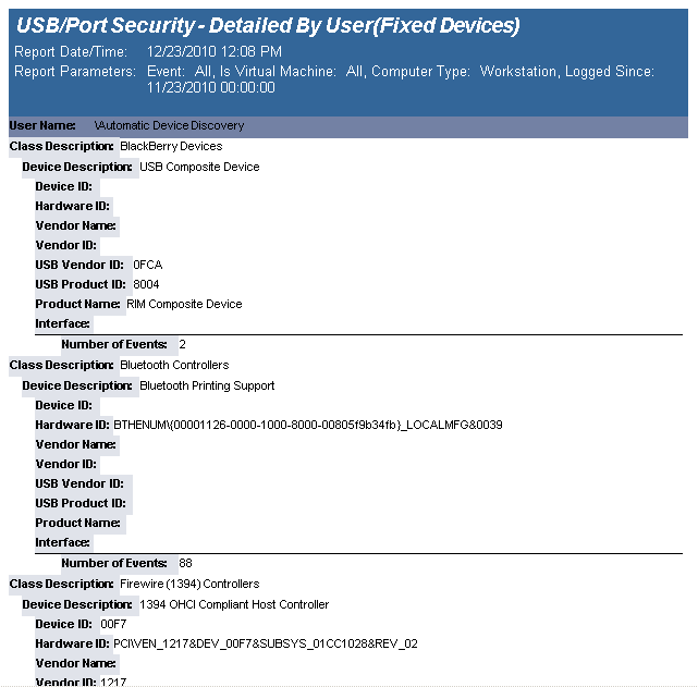The USB-Port Security - Detailed by User (Fixed Devices)  report reports on data collected about all Fixed device classes.