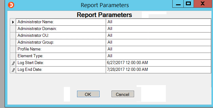 All pre-defined reports have a parameter dialog that displays prior to the actual report. This parameter dialog is used to filter data on the reports. The filters offered for each report are used in the SQL statement that fetches the data for the report. The parameter dialogs differ based on the selected report.