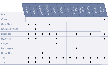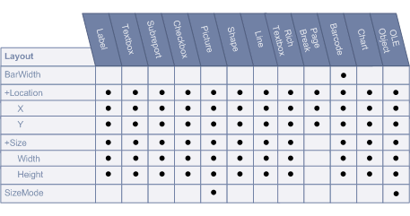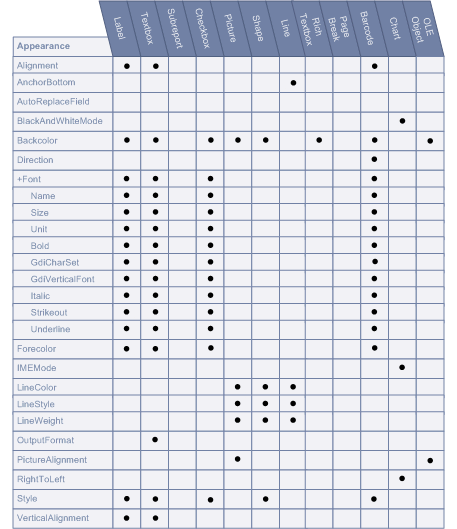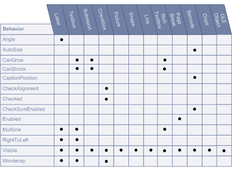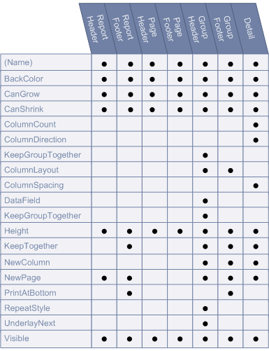 The Properties Toolbox is used to change the properties of all report elements, including report sections (bands) and controls. The following list defines the supported properties of each band/control.