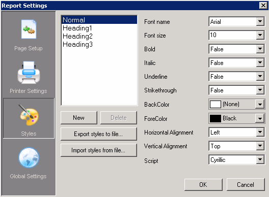 The styles dialog is used to create style sheet settings that can be used within the report design. Once styles are created, they can be used to easily and consistently modify the appearance of text associated controls within the report. A style is applied to a control via the Style property for the control.