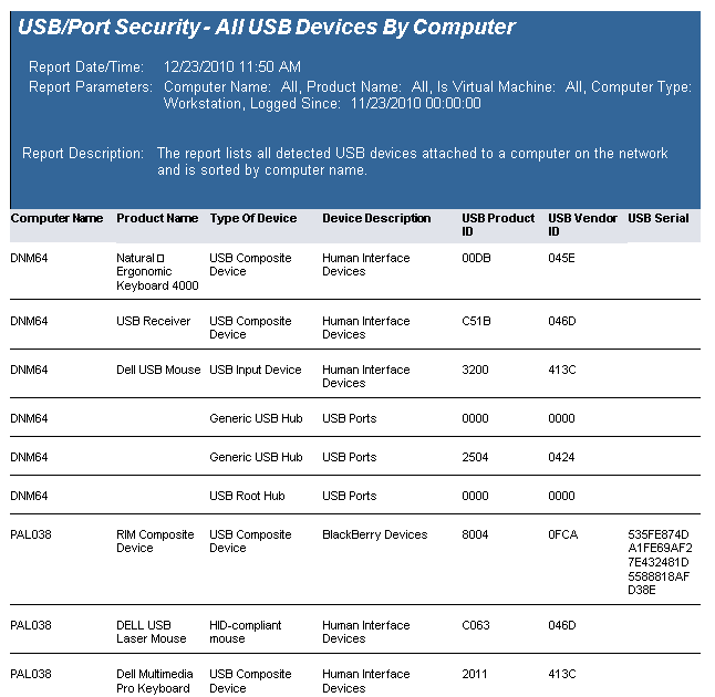 The USB-Port Security - All USB Devices by Computer report reports on data collected about all USB devices used on the network and are within the report parameters.