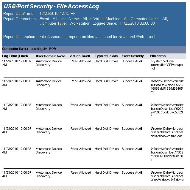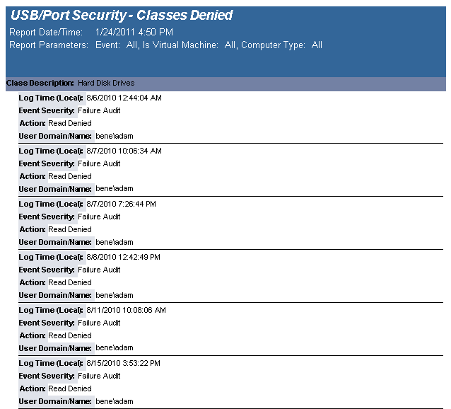 The USB-Port Security - All Device Events report reports on data collected about the following device events: Plugin/Powerup, Unplug/Disable, Device Disabled, Device Enabled, Read and Write Denied and Read and Write Allowed. Filenames will be reported on all read and write events to a removable storage device.
