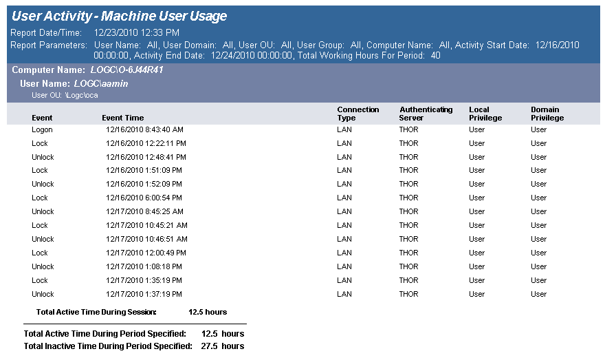 The User Activity - Machine User Usage report details user activity on each computer. Total active and inactive session times are calculated. Total active time per session is the time between logon or unlock to lock or logoff.  Total inactive time is (total working hours for the time period) (total active time for the time period).