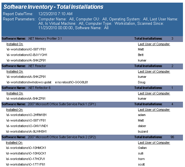 The Software Inventory - Total Installations with Computer List report reports on data collected from computers logging onto the network. The report details each computer's installed software, sorted by Software Name..