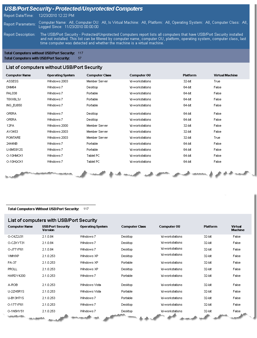 The USB/Port Security Protected/Unprotected Computers report lists all computers that have USB/Port Security client installed and those that do not have the client installed and grouped accordingly.