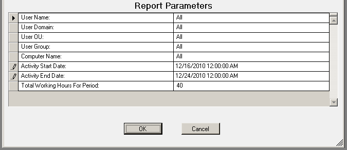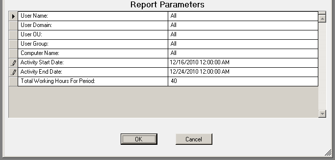The User Activity report details user activity across multiple computers.  Usage events are grouped by user then by each computer they have logged on to. Total active time is tallied for all computers.  Total active time per session is (login or unlock) to (lock or logoff).  Total inactive time is (total working hours for the time period) (total active time for the time period) (no lower than 0).