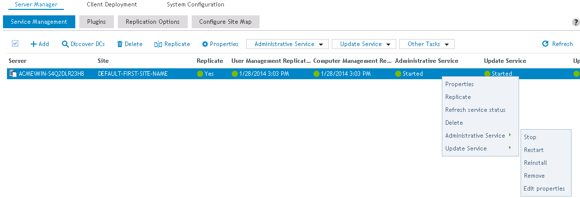 To configure the Administrative service in the Server Manager grid, click Properties for the server that the service will be configured for. The service can also be managed by selecting Properties in the service drop list in the DA Administrative Service column.