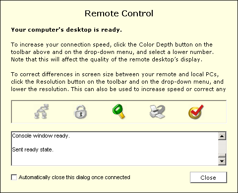Click to set the dialog size to the same size as the host computer. Click to fit the host computer dialog within the client's dialog. Click to view the host computer in full screen mode.