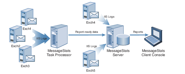 In this type of deployment, data from the remote Exchange servers is processed by the local task processor. Then the report-ready data is transferred to the MessageStats Server and stored in the database. This minimizes network traffic by eliminating the need to copy all the data from the remote servers.