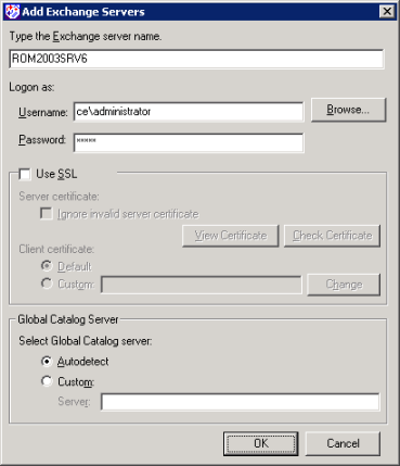 Select the Use SSL check box in the Add Exchange Servers dialog box if you want to connect to the server using a secure connection. Note that to use a secure connection, the Web server installed on the computer running Exchange Server must be configured to support SSL. For the server to be successfully processed via the secured connection, the security certificate must be issued by a trusted company, the security certificate date must be valid, and the security certificate must have a valid name matching the specified Exchange server name. See the Web server and Exchange Server documentation for details.