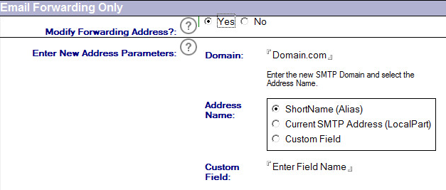 If using mail forwarding for mail routing to Office 365 or Exchange during the coexistence period without Integration, then select this option. This option will only update the Mail Forwarding Address in the selected Person document(s) rather than the Domain and Mail Type as the above operation performs. If No is selected then no changes will occur and the normal operations will be executed. |
