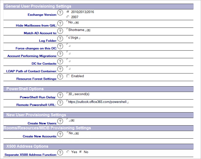 Appears if Create New Accounts is set to Yes. Organizational Unit to create new Shared Mailbox objects. This must be DN format. Leave blank for the default user container defined in Exchange. |