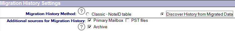 Select the method for determining migration history. The Classic – NoteID option uses Migrator for Notes migration history table, stored on the XML server. The Discover History from Migrated Data option scans the migrated data (mailbox, archives, etc.) to find messages previously migrated from Notes. The default selection is ‘Discover History from Migrated Data’. |
