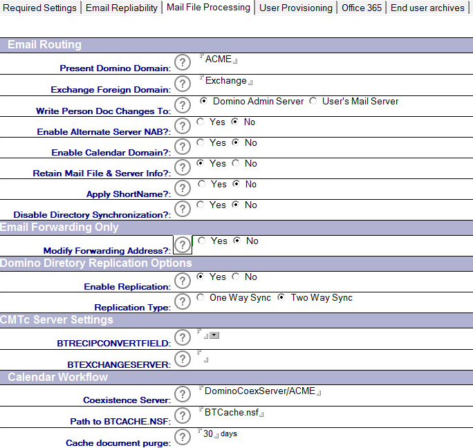 Mail File Processing works with the assumption that Integration for Notes is configured between Domino and Exchange. The Email Forwarding Only option can be used if Integration for Notes is not deployed. This allows for standard Domino email forwarding functions. You must configure this section prior to using the Maintain Transitional Calendar Workflow (MTCW) agent. This agent gathers recurrence pattern information for meetings and copies that information into the BTCache.nsf, which allows calendar workflow to behave as expected regardless of migration status of the chairperson or attendees. |