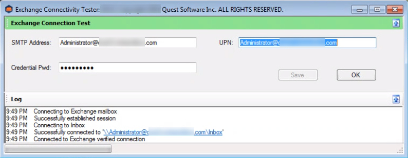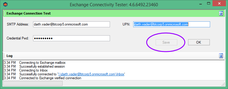 The Exchange Connectivity Tester will launch with the information you entered in the installer. Press the Test button to verify the account credentials can connect to Exchange.
