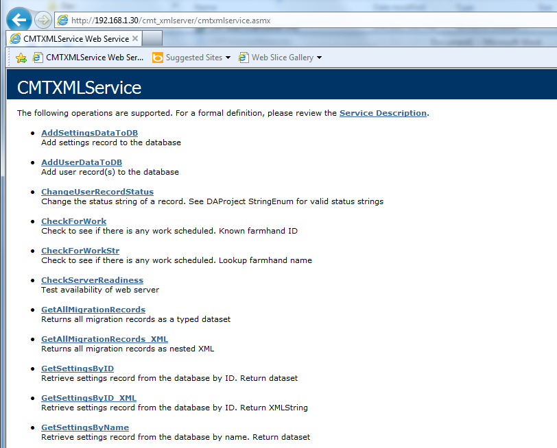 • Open a web browser, and access the web services page at http://servername/cmt_xmlserver/cmtxmlservice.asmx, where servername is the IP address or name of the system hosting the CMT XML server.  You should be prompted for credentials to use when accessing the site. Enter the user credentials in the form of “MyDomain\Username”.
