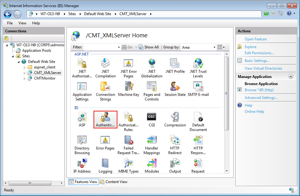 • Expand Web services in the Internet Information Services (IIS) management console, and select the CMT_XMLServer site; open the Authentication options:
