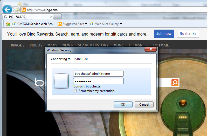 If you are logged in to the domain, and have your site listed as a ‘trusted site’ in Internet Explorer, you will see the web page without prompting for username and password. It is recommended that testing the security of the server be done without the xml server added as a trusted site. To check your configuration, open “Options” in internet explorer, click “Security”, highlight “Trusted sites”, and click on the “Sites” button.