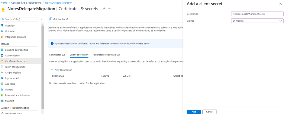 Use the navigator to click on Certificates & Secrets. Use the New client secret to Add a client secret.