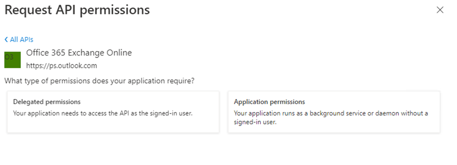 Use the Add a permission button again and for the permissions select APIs my organization uses and then locate and select Office 365 Exchange Online.