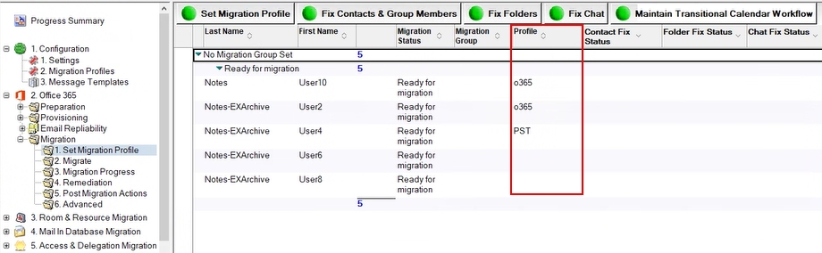 1. Expand the Migration | 1. Set Migration Profile views, select users and click the Set Migration Profile button: