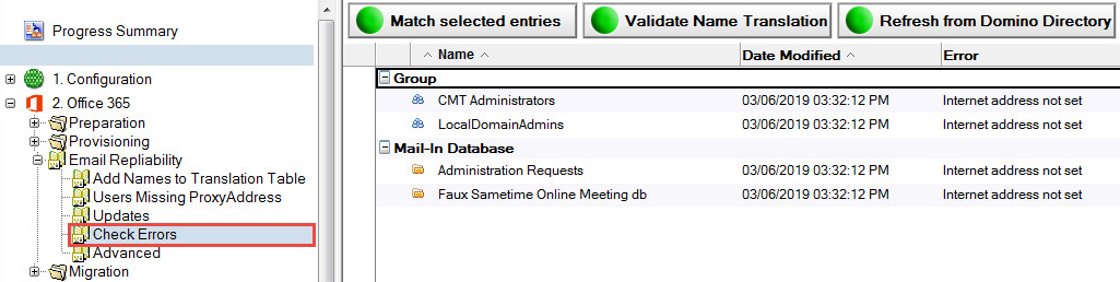 It is recommended to check accounts in Domino and verify the corresponding entries in Active Directory. All items to be translated require an Internet Address (SMTP) in Domino, but some items, like Domino system groups, will not be expected to have these and can be safely ignored.