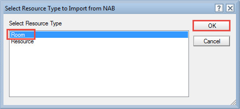 2. The Select Resource Type to Import from NAB dialog box appears; Room is selected by default; click OK: