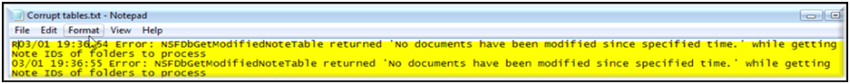 When the log file records the following statement “NSFDbGetModifiedNoteTable returned 'No documents have been modified since specified time.' while getting Note IDs of folders to process”, the tables in the mail template are corrupt. To fix this, the common practice is to create a new copy of the mail file, then replace the database design.