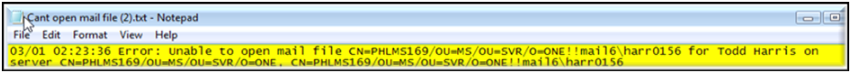 If the mail file does not exist at the specified location, or the migration account does not have access to the mail file, Migrator for Notes reports a status of “Migration initialization failed.” This status can appear if either the source or destination server is unavailable, or if the migration account does not have access to the message store. Regardless of the number of attempts made, this type of problem cannot be successful until it is resolved. If the log file records a similar message as the following example, “Unable to open mail file CN=SERVERNAME/OU=MS/OU=SVR/O=ONE!!mail6\harr0156,” either the mail file is not present or there is an ECL alert on the workstation that is running that user. In case of ECL alerts, click through them until they stop appearing.