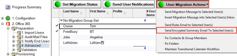 1. Select user(s), and then select User Migration Actions | Send Encrypted Email Summary to Selected User(s):