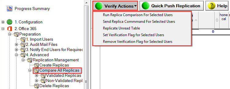 4. Select an option form the Verify Actions drop-down menu; a Quick Push Replication option is also available; click the Help button for more information about the replica comparison view