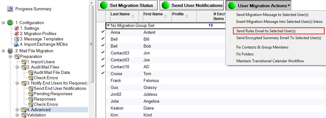 1. Select user(s), and then select User Migration Actions | Send Rules Email to Selected User(s):