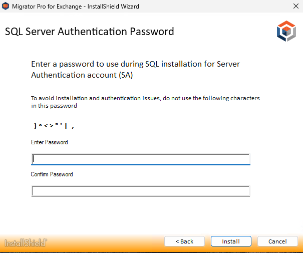 The wizard then prompts you for the SQL Server Authentication Password. Enter a password for use during SQL installation for the Server Authentication (SA) account.
