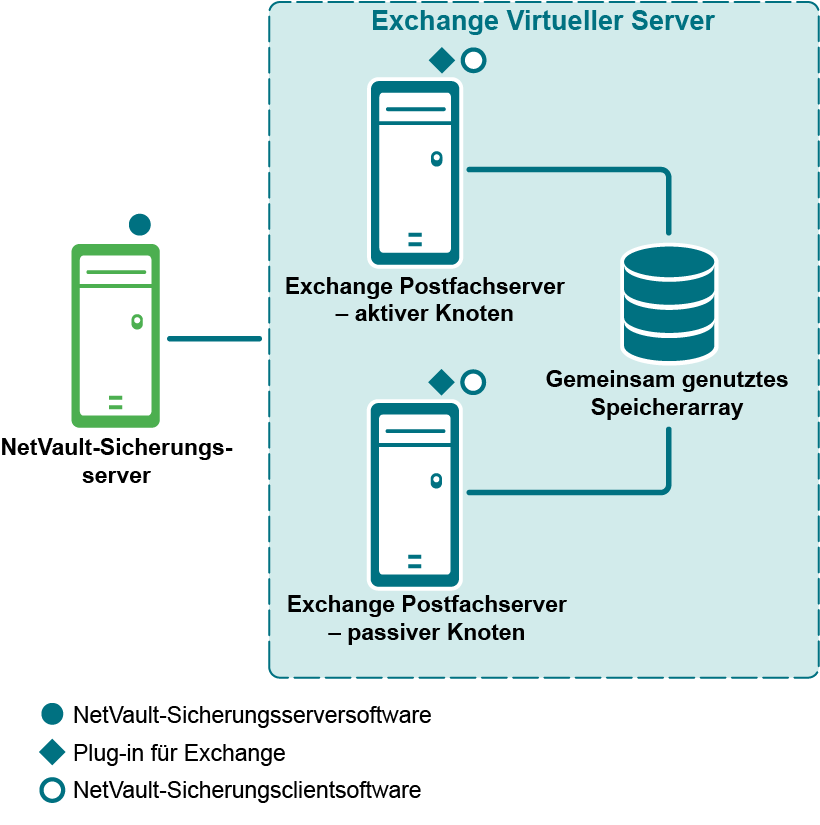 In einer CCR-Bereitstellung wird das Plug-in auf dem virtuellen Exchange Server installiert. Der virtuelle Exchange Server ist eine Gruppe von Knoten und Hosts, die das Cluster bilden. Der NetVault Backup-Server sieht das Cluster als einzelnen Client, der als virtueller Client bezeichnet wird. Bei der Installation des Plug‑in für Exchange auf dem virtuellen Server wird das Plug-in mit dem Clustersupport von NetVault Backup auf allen Knoten installiert. Der virtuelle Client von NetVault Backup wird zur Sicherung des aktiven oder passiven Knotens verwendet, der in diesem Beispiel der virtuelle Exchange Server ist.