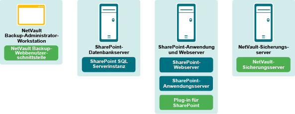 Bei einer Einzelserverbereitstellung befinden sich die SharePoint SQL Serverinstanz, der Anwendungsserver und der Webserver auf demselben Computer oder Server. Das Plug-in wird auf diesem einzelnen Server installiert und führt alle Sicherungen und Wiederherstellungen von diesem Server aus durch.