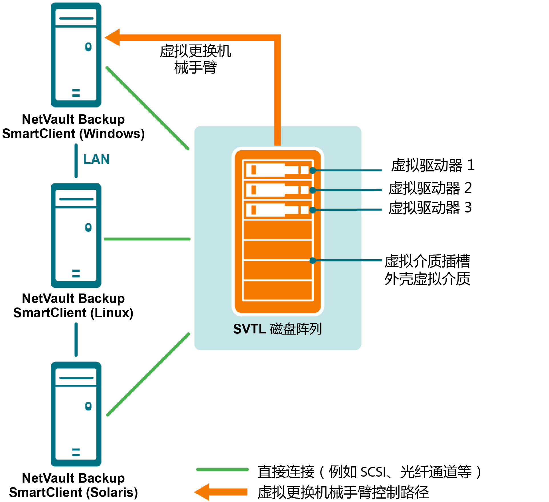 通过让您与多个 NetVault Backup 计算机共享一个 VTL,NetVault Backup 共享虚拟磁带库 (SVTL) 扩展了 VTL 实现,无需 LAN 即可进行备份。