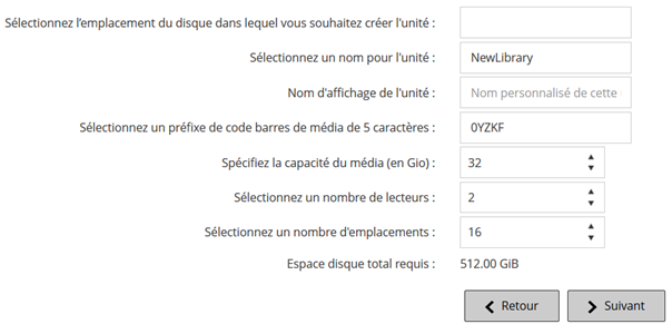 Dans la page Ajouter des unités de stockage, sélectionnez l'option Bibliothèque de bandes virtuelles / changeur de médias et la case Rajouter une unité virtuelle générée précédemment.