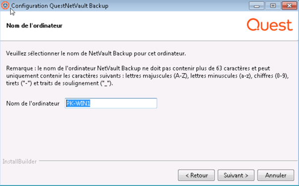Dans la boîte de dialogue Nom de l'ordinateur, spécifiez un nom unique pour le serveur NetVault Backup. Cliquez sur Suivant. |