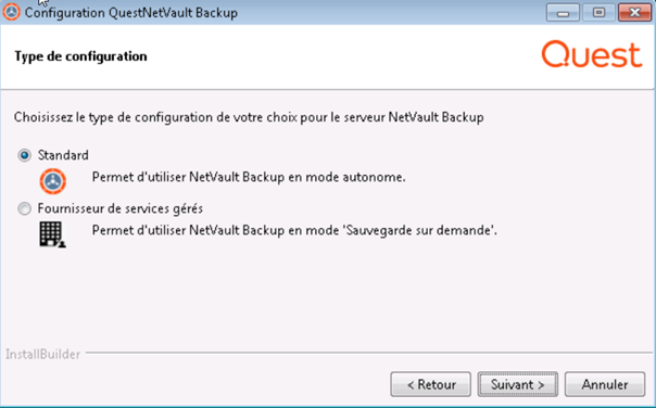 Standard : cette option vous permet d'utiliser le serveur NetVault Backup en mode autonome. |