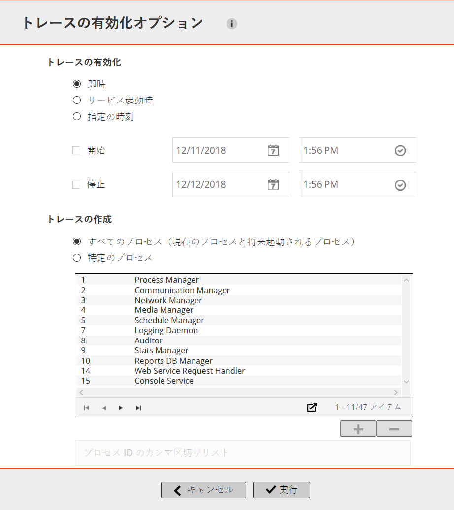重要: 複数のクライアントを選択する場合、[トレースの有効化オプション]ドロワにプロセス名のリストは表示されません。[すべてのプロセス(現在のプロセスと将来起動されるプロセス)]オプションを使用するか、関連するボックスでプロセスIDのリストを指定できます。