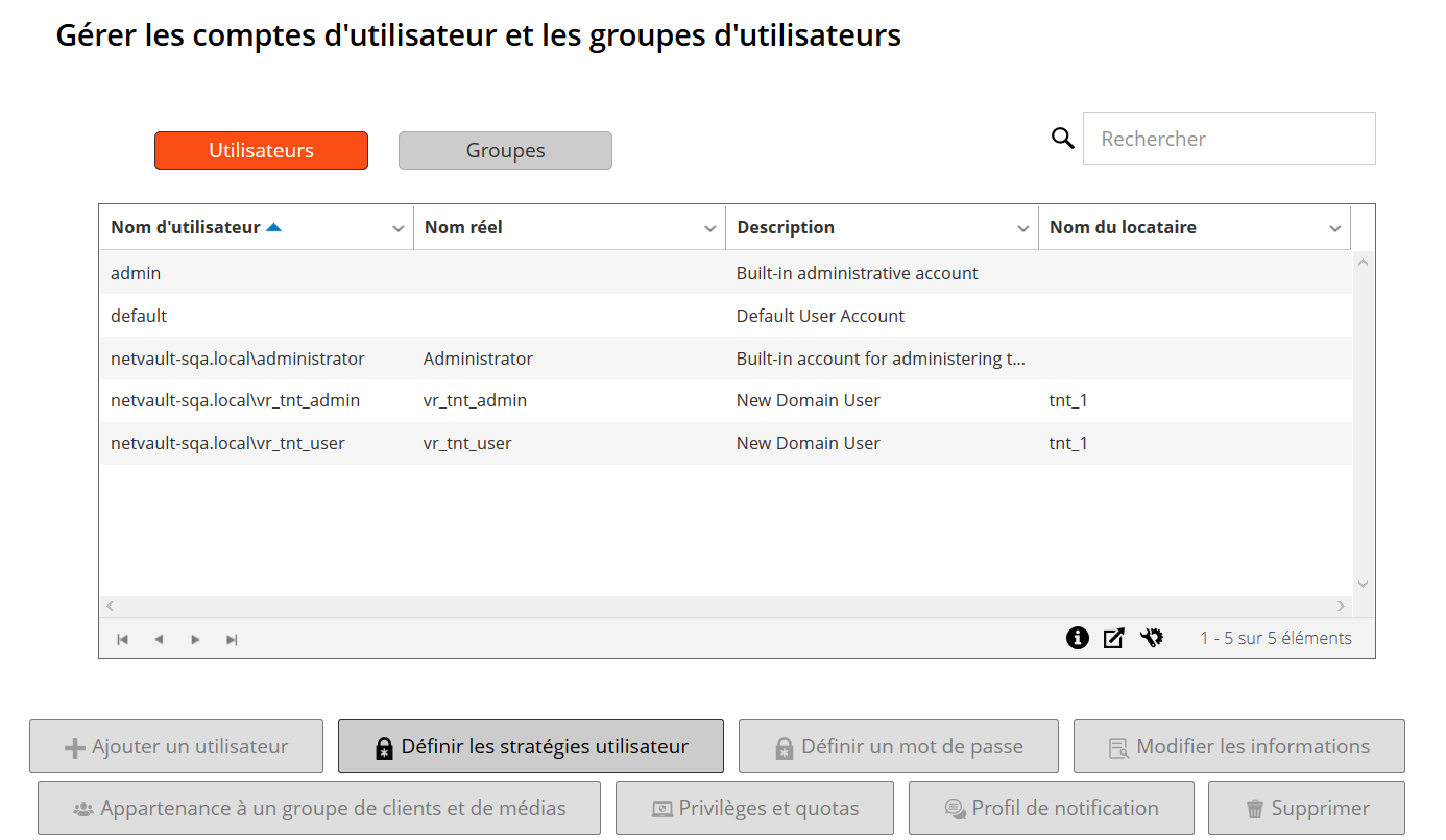 Les comptes d'utilisateur peuvent être créés à partir de la page Gérer les comptes d'utilisateur et les groupes d'utilisateurs. Seul l'administrateur peut créer et gérer des comptes d'utilisateur dans NetVault Backup.