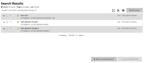 The Search for Files in Savesets details drawer opens. Repeat steps 1-3.To expand an item and view the file metadata, such as plug-in, job name, job ID, saveset ID, and backup date and time, click the corresponding plus icon.