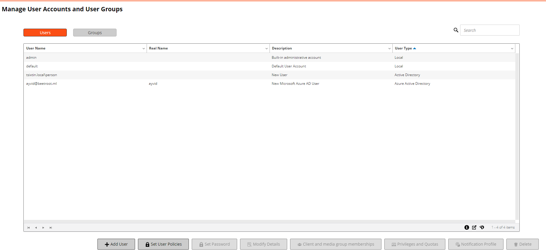 If your environment uses Active Directory (AD) or Microsoft Azure Active Directory (Azure AD), you can also integrate AD and Azure AD users with NetVault, as well as manage user groups. For more information, see Integrating Active Directory with NetVault and Using Azure Active Directory as an identity provider.