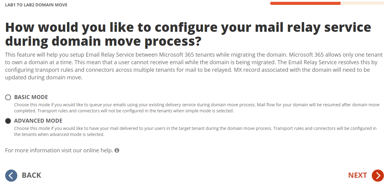 Advanced Mode offers a full coexistence experience for end-users that are affected by the domain move. It relays incoming email messages sent to the source user mailboxes to their matching target user mailboxes. The benefit of choosing Advanced Mode is there is no email disruption while the domain is being moved.
