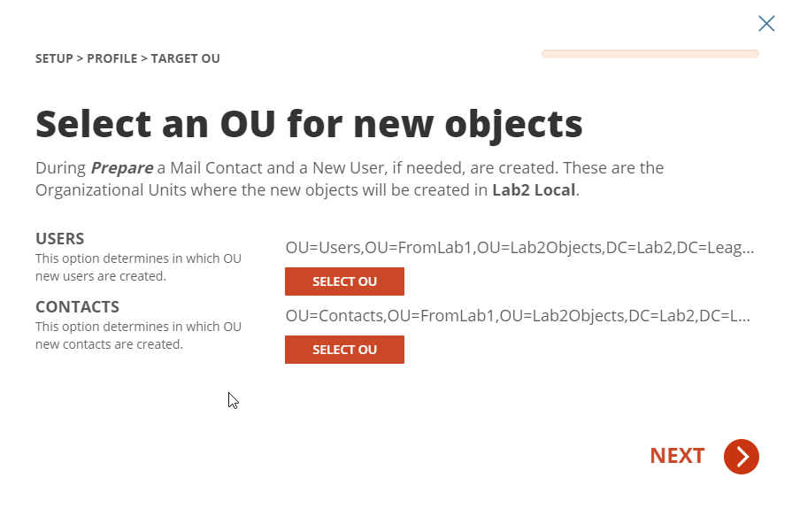 - In the pop-up window, click Select OU and choose an OU for the Users and Contacts in the target Active Directory. Click Next and choose the OU for the source Active Directory. Click Finish to close the pop-up window.