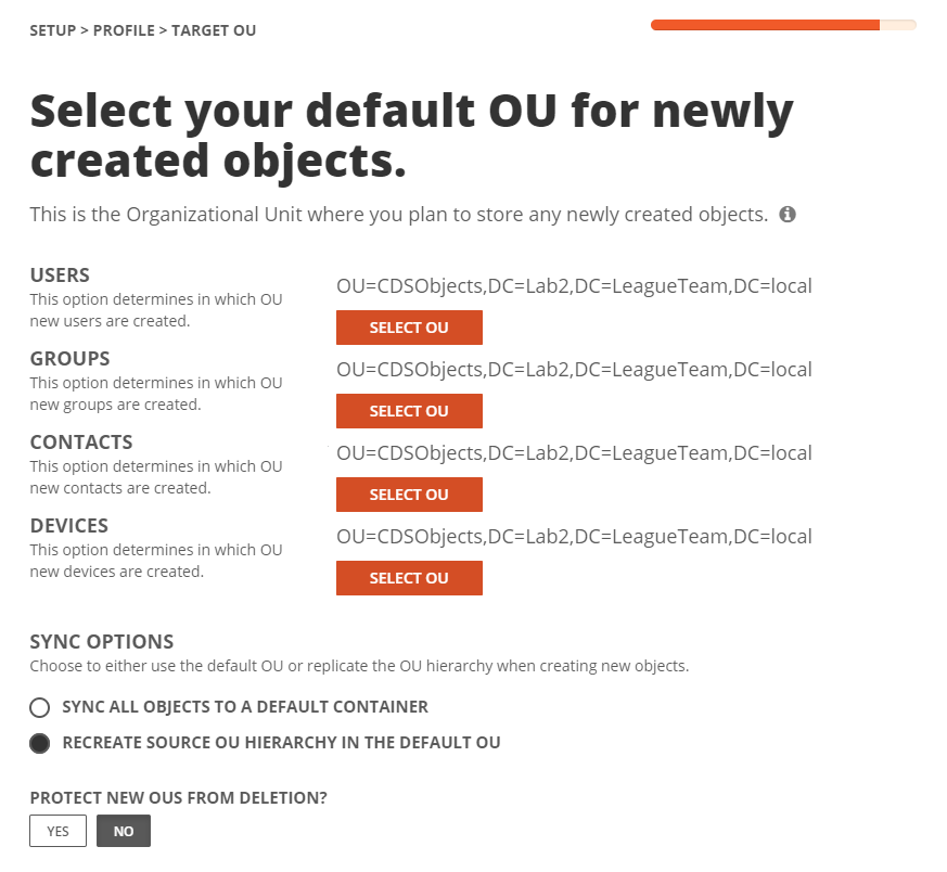 8. Select the default OU for newly created objects for Users, Groups, Contacts, and Devices.  In our case, we can select the same OU for all object types as we are only syncing user as contact.