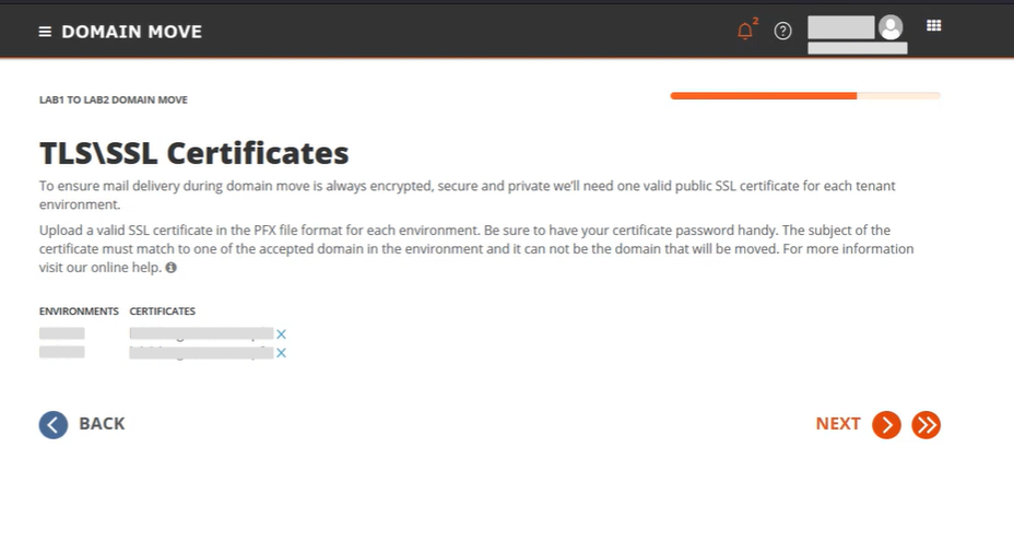 Certificates will display, under Settings within the Domain Move project. Certificates are used to ensure secure message transit with TLS.