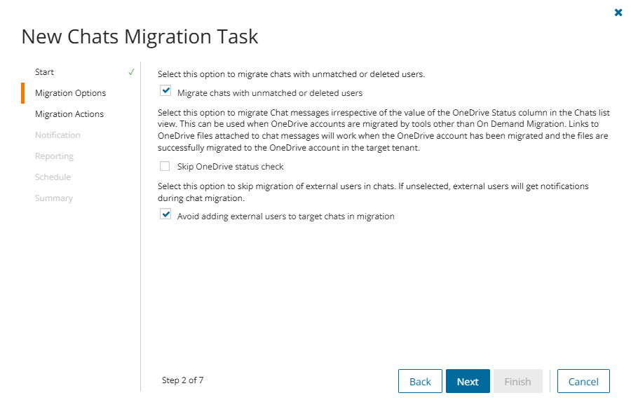 - Skip OneDrive status check - select this option to migrate Chat messages irrespective of the value of the OneDrive Status column in the Chats list view. This is helpful because OneDrive accounts could be migrated by tools other than On Demand Migration, and the OneDrive Status column indicates New instead of Completed. Links to OneDrive files attached to chat messages will work when the OneDrive account has been migrated and the files are successfully migrated to the OneDrive account in the target tenant.