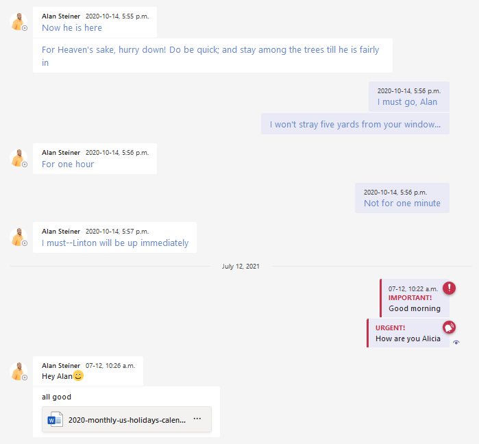 When the message set is merged and migrated, they appear in the target tenant as shown below. The migration service determines the merge set. Messages retain their chronological order and the time stamp is converted to GMT.