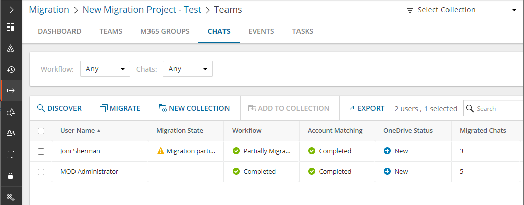 - Migrated Chats - number of chats migrated for the user. This may be fewer than the total number of chats. If a participant is not matched or OneDrive not migrated then migration of the chat is intentionally skipped and the event documented on the Events tab.
